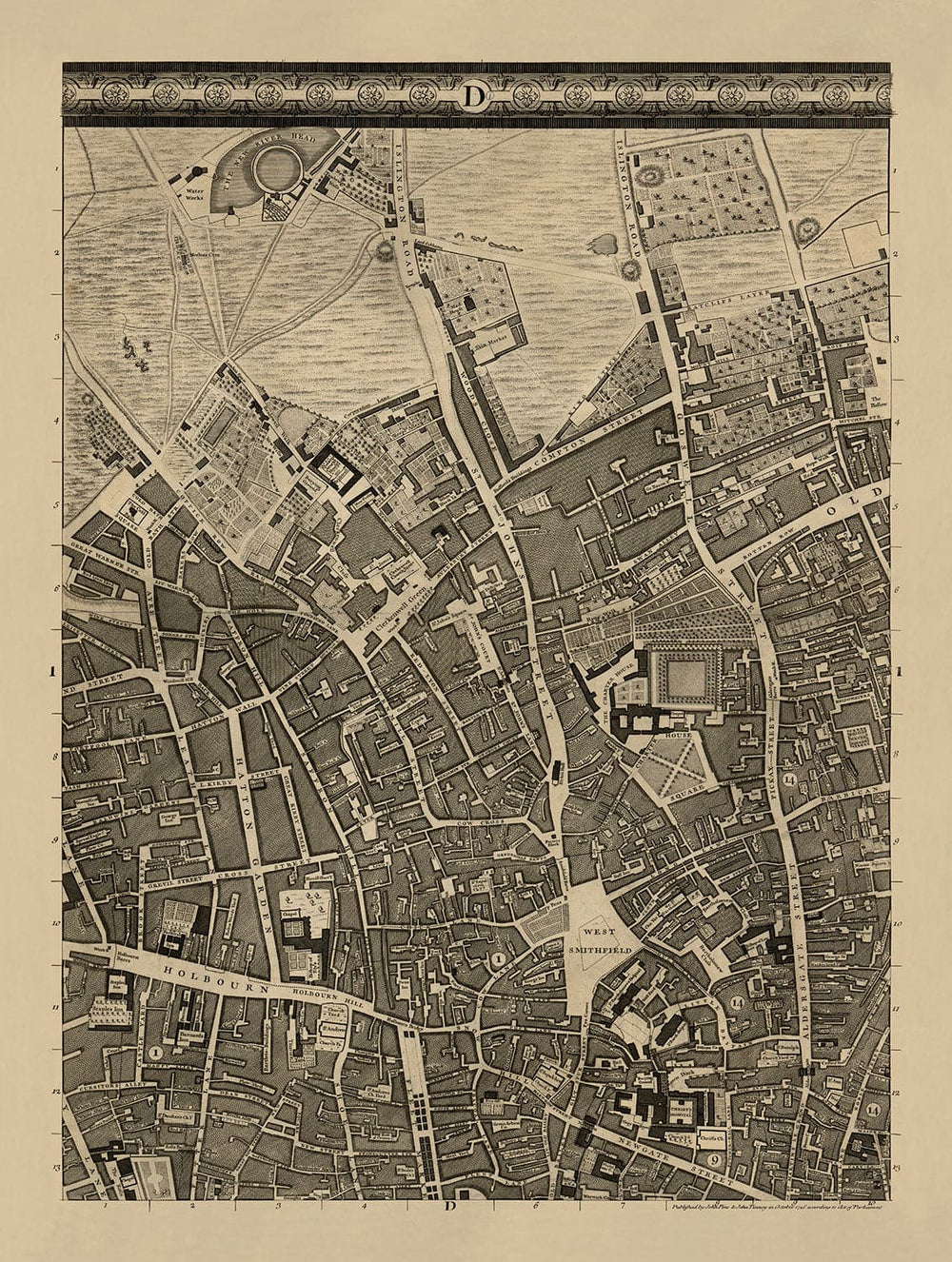 Old Map of London, 1746 by John Rocque, D1: Holborn, Clerkenwell, Farringdon, Barbican, Westminster, City of London, Smithfield Market