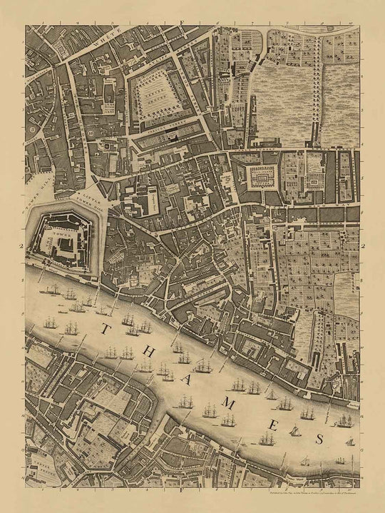 The focal point of this map is the Tower of London, but this map also includes Shad Thames, St Saviours Dock, and the areas that would become St Katherine Dock and London Docks. You might be able to recognise some other landmarks if you know Tower Hamlets and Bermondsey well.