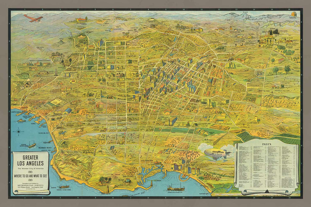This map was originally published to celebrate the 1932 Summer Olympics in Los Angeles, and you can clearly see the Olympic Village in Inglewood, Olympic Stadium near USC, Olympic Auditorium and Olympic Rowing Course.