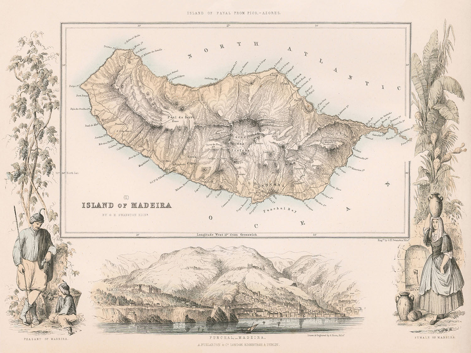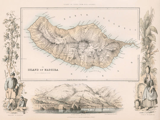 - Vignettes of local people (Peasant of Madeira and Female of Madeira) and flora.