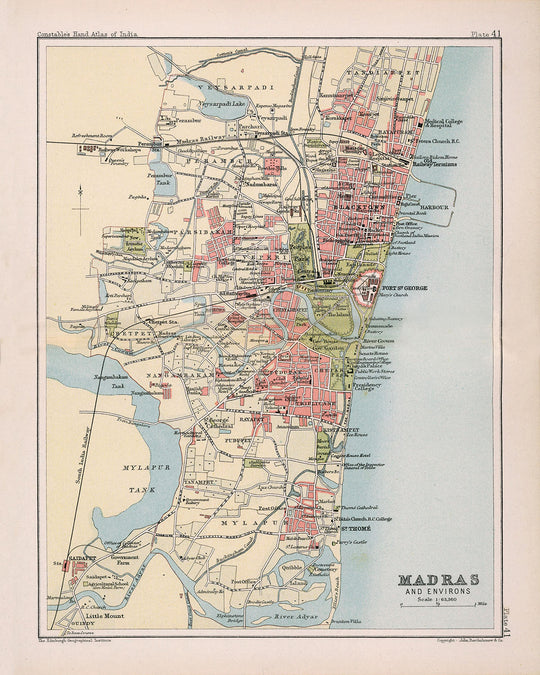 Old Map of Madras (Chennai), 1893: City Centre, Fort St. George, Marina Beach, Mylapore Temple