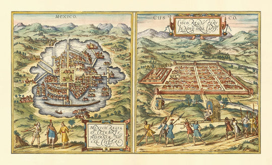 Old Map of Mexico City & Cusco, 1572 by Georg Braun: Aztec, Peru, Texcoco, Tenochtitlan, Spanish Colonialism