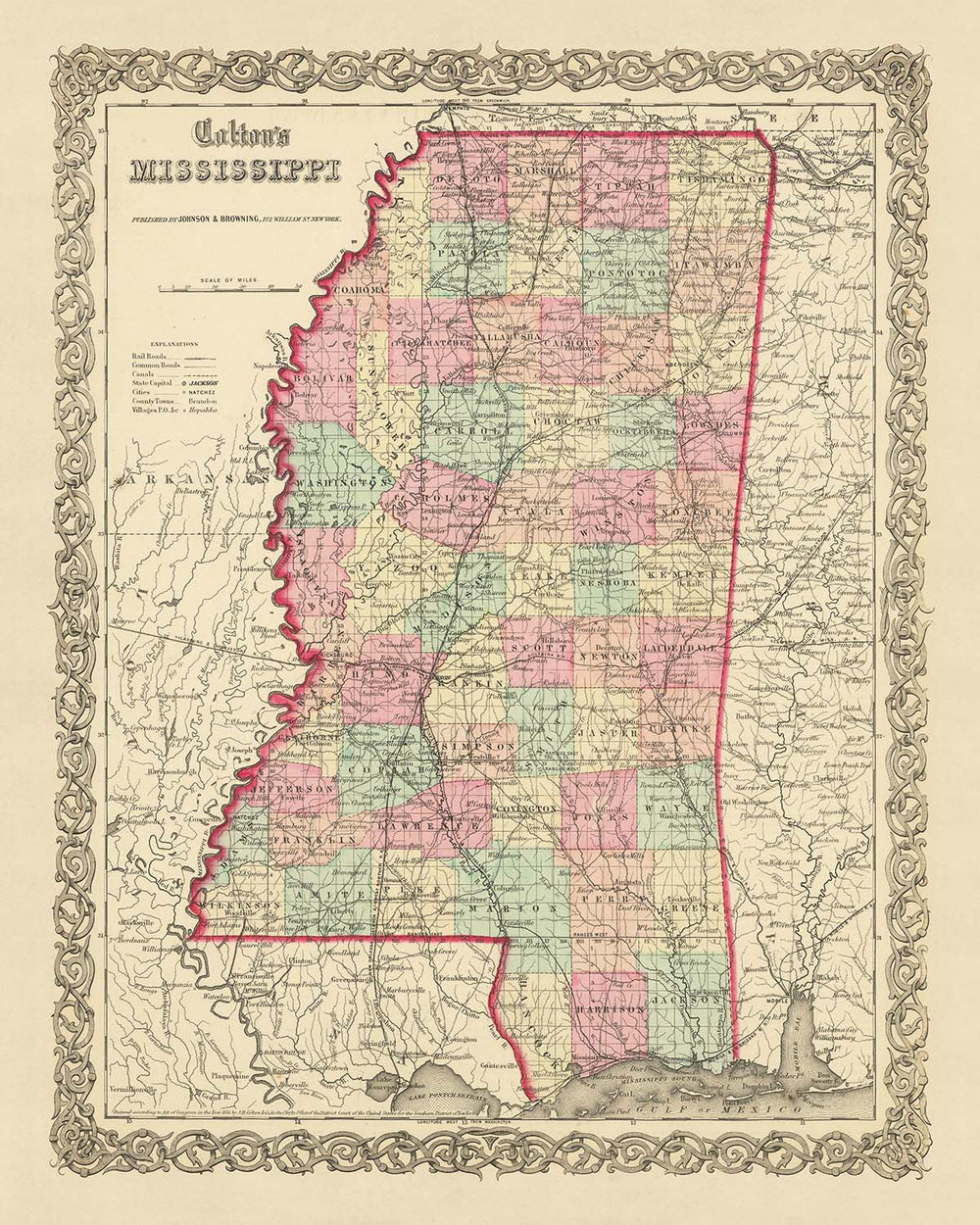 It's important to note that over the past 150 years, many names and borders have changed. This map captures the essence of a bygone era, providing a fascinating contrast to the modern state of Mississippi. The historical significance of this map, coupled with the renowned craftsmanship of J.H. Colton, makes it a valuable addition to any collection.