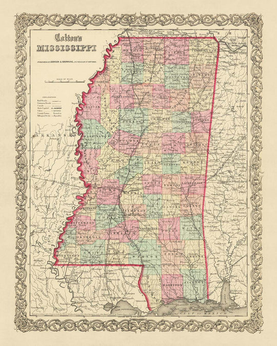 Immerse yourself in the rich history of the United States with this exquisite old map of Mississippi, crafted by none other than J.H. Colton in 1855. Known as one of the finest American mapmakers of his era, Colton's work represents an early snapshot of our nation's history, a time when many settlements were yet to be founded and borders were constantly evolving. This map, in particular, offers a unique glimpse into the past, showcasing the state of Mississippi in its nascent stage, before the advent of modern infrastructure and development.