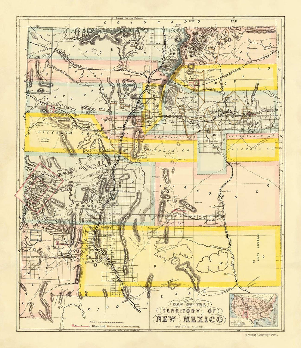 Old Map of New Mexico Territory, USA, 1873: Land Grants, Rio Grande, Native Americans, Sante Fe, Rocky Mountains