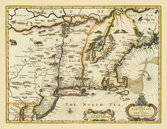 This old, handcoloured and wonderful map shows New York and New England in 1676. It was created by John Speed and engraved by Jodocus Hondius.