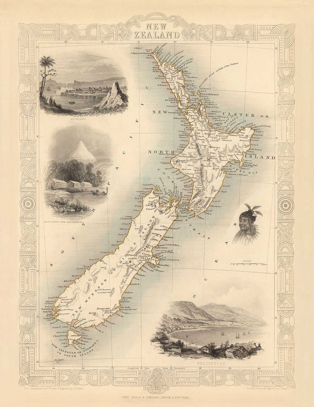 This delightful, Victorian map of New Zealand was originally engraved by John Rapkin and published by J. Tallis & Co in 1851. It is presented here with its original 150-year-old handcolouring and is, without doubt, one of the finest and most detailed historic maps of New Zealand.