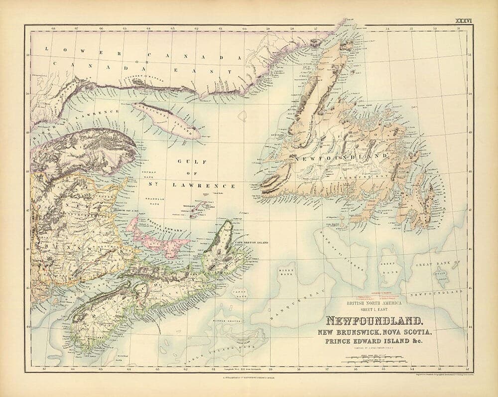 This old, full colour and wonderful map shows British North America, including Nova Scotia, Newfoundland and New Brunswick as they were in 1872. It was engraved by G.H. Swanston and published by A. Fullarton & Co.