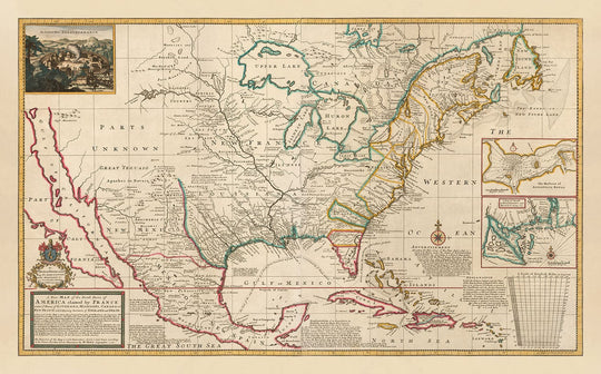 This is one of the earliest and most detailed maps of the interior of North America. It was compiled at an intriguing point of history when most of the middle of the continent was called Louisiana or New France, and Mexico and the West Coast were claimed by Spain. The east coast, of course, was claimed by England!