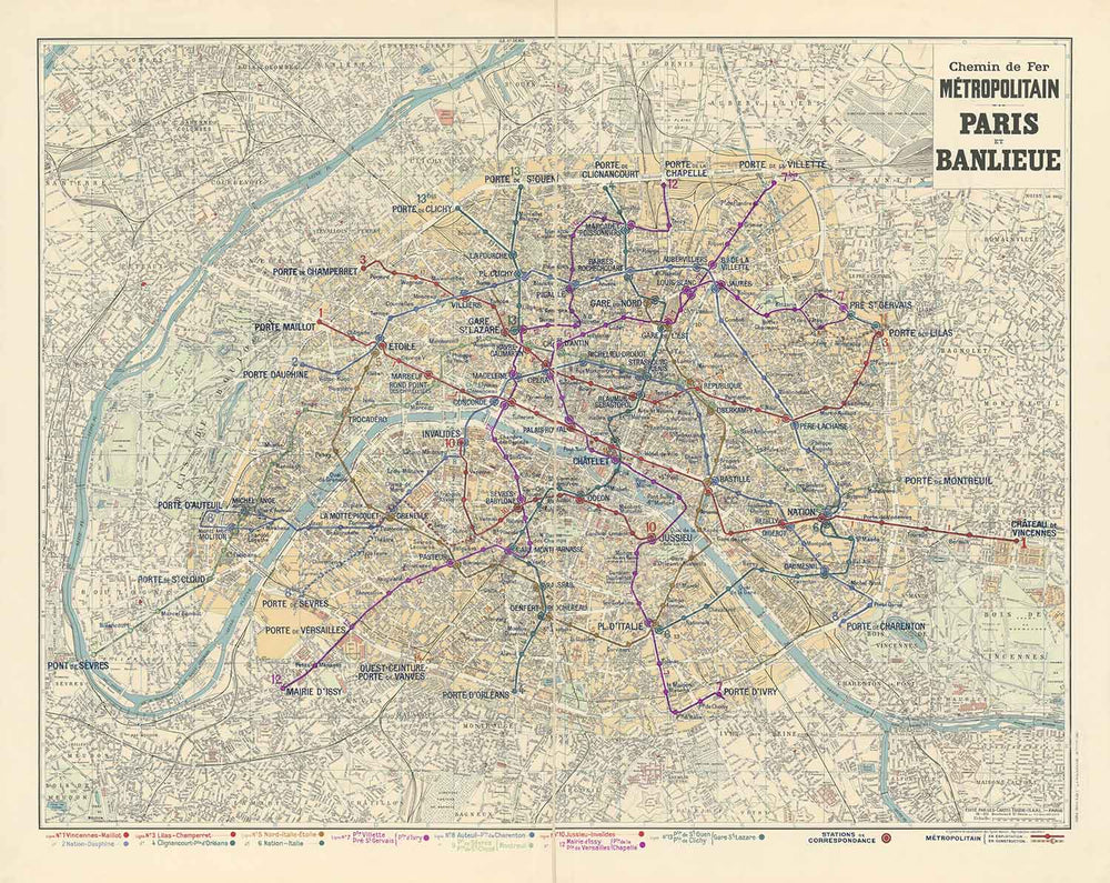This map was published just a few years after the Métro was officially formed. Each of the lines is coloured differently, and the train stations - just like today - are represented by large circles.