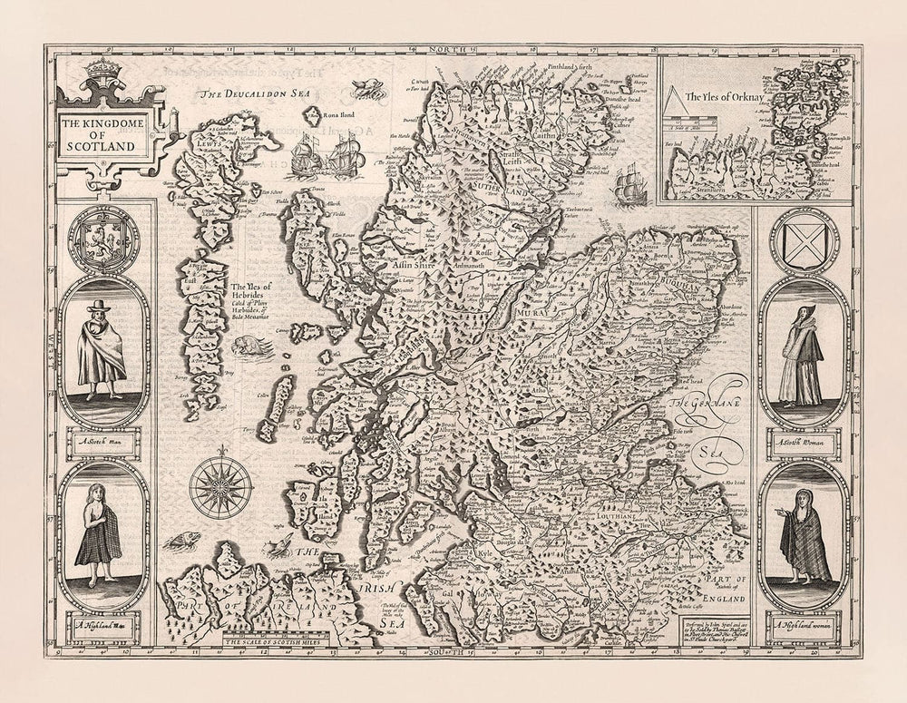 Many of the towns, villages and cities in Scotland are already visible in this map. In the top right there is an inset engraving of the Orkney Islands. Inset are engravings of various royals, such as King James of Great Britain, France and Ireland, Queen Anne and Prince Henry. A later version of the map would see the royals replaced by commoners. The Shetland Isles, Hebrides, Skye, Loch Ness, Loch Lomond, Mull of Kintyre... they're all here.