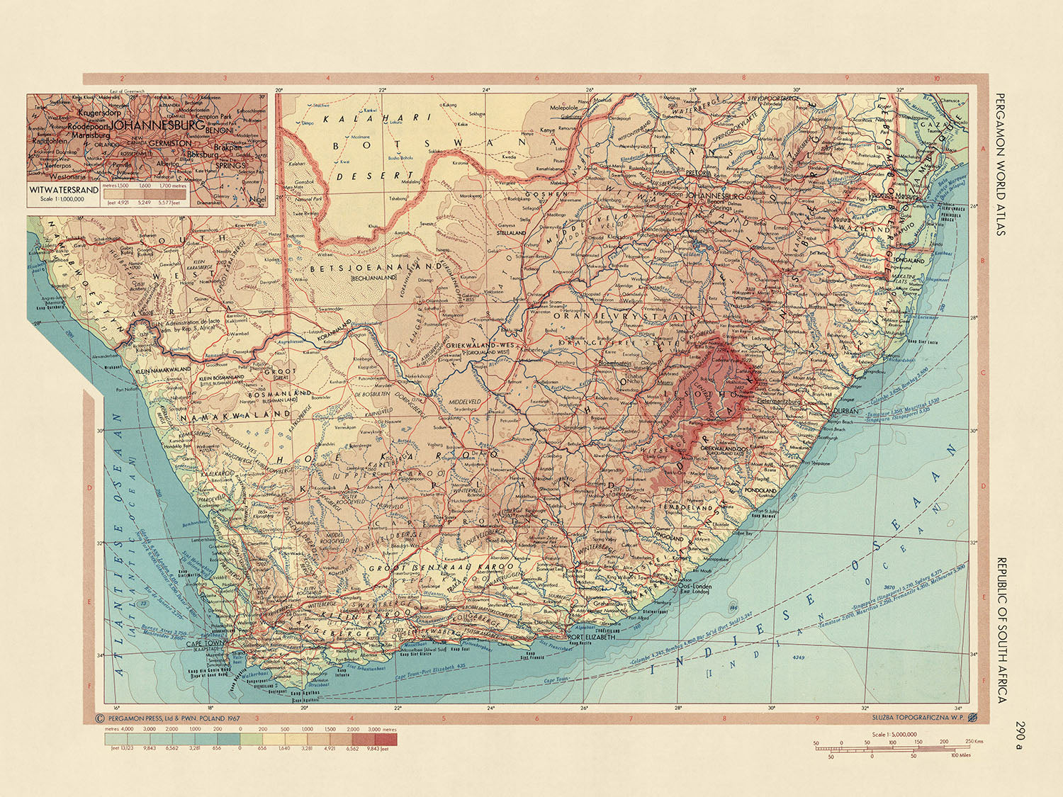 This 1967 map of the Republic of South Africa, published by the Polish Army Topography Service, is a detailed political and physical map that provides a comprehensive overview of the country's geography and political landscape. The map covers the entirety of South Africa, with a focus on its topography, major cities, and significant landmarks.