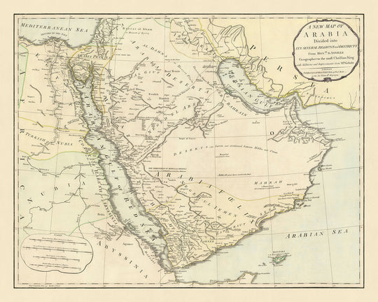 "A New Map of Arabia, Divided Into Its Several Regions and Districts" is a remarkable testament to the cartographic prowess of the late 18th century. Published in 1794 by the esteemed Laurie & Whittle, this map masterfully illustrates the intricate geopolitical landscape of the Middle East. The precision and detail with which the country borders of Saudi Arabia, Iraq, Syria, Yemen, Oman, Bahrain, Kuwait, and Egypt are depicted are truly commendable, making this a noteworthy national country map. Each region is carefully demarcated, providing a fascinating insight into the territorial divisions of the time.
