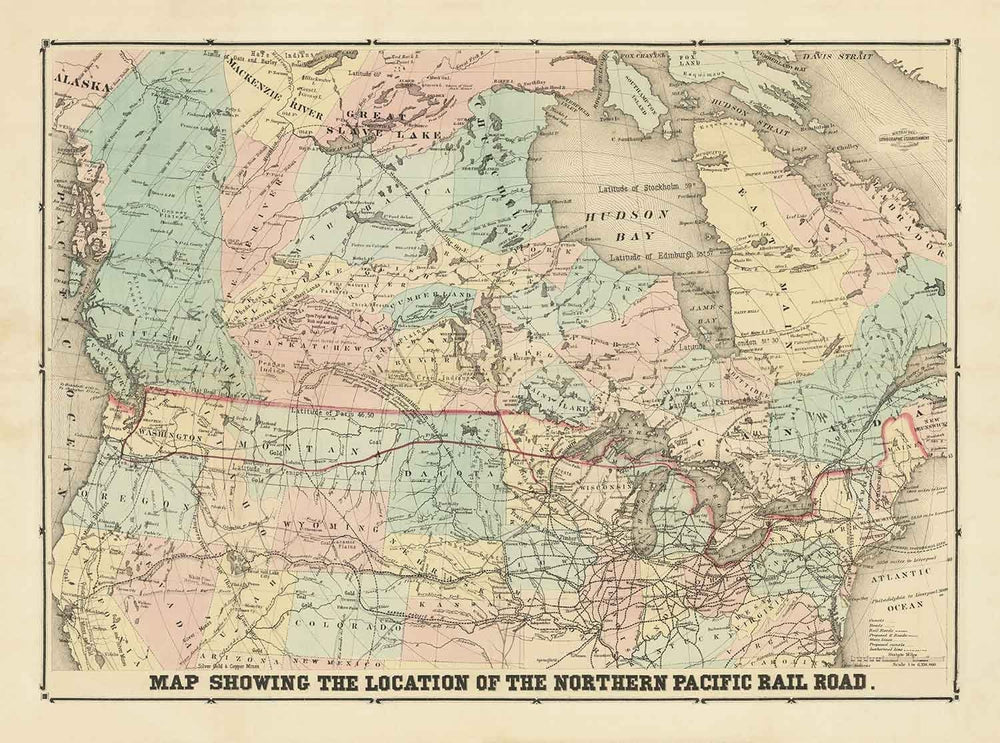Old Map of the Northern Pacific Railway, 1870 by Traubel: Railroads in Canada & USA
