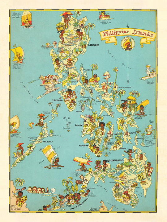 Old Map of the Philippines by Ruth Taylor White, 1935: Manila, Luzon, Samar, Mindanao, and the Sulu Archipelago