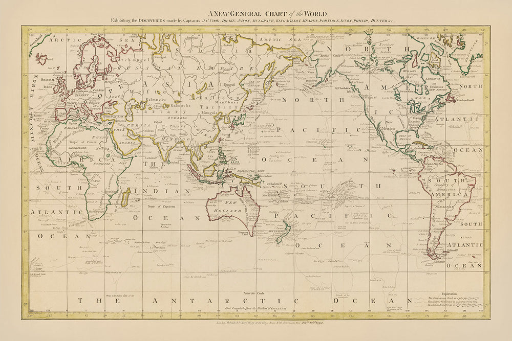 - Interesting context related to the topics and themes: The map was published when European exploration of the Pacific Ocean was at its height, highlighting Cook's voyages which were crucial in changing European understanding of the world.