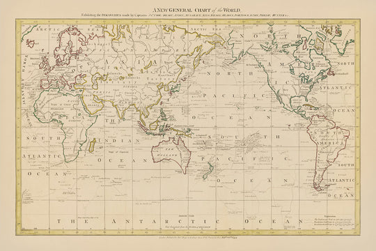 The historical and geographical insights provided by this map are further enriched by its depiction of the evolving understanding of regions such as Australia and New Zealand. The connected outline of Australia and Tasmania, known then as Van Diemen’s Land, alongside the toponyms bestowed by Cook and other European explorers, offers a fascinating glimpse into the cartographic knowledge of the time. This map not only charts the physical geography of the world but also captures the momentous shift in understanding the globe's southern lands, marking a significant chapter in the history of exploration.