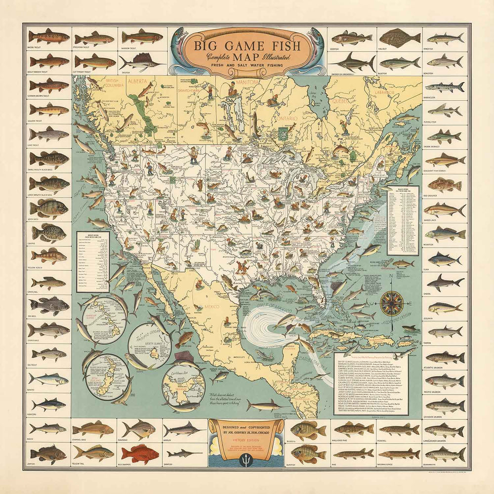 This wonderful old map of Big Game Fishing in the USA was originally published in 1936. It was created by Gordon Ertz.