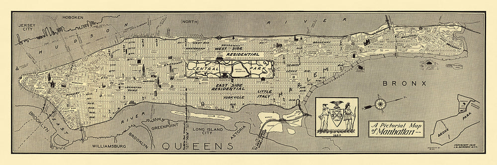 Old Pictorial Map of Manhattan by Seidman, 1939: Central Park, Empire State, Harlem, Times Square, Broadway