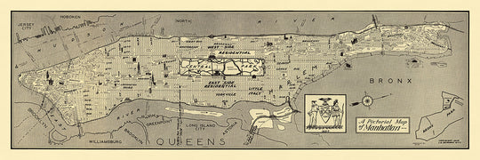 The map's depiction of Manhattan's rivers and surrounding areas adds another layer of historical context. The Hudson River and East River are clearly marked, along with neighboring regions like Jersey City, Hoboken, Brooklyn, and Queens. This comprehensive view of Manhattan and its environs provides a broader understanding of the city's geographical and cultural significance. "A Pictorial Map of Manhattan" is not just a map; it is a historical artifact that captures the spirit and essence of New York City in the late 1930s.