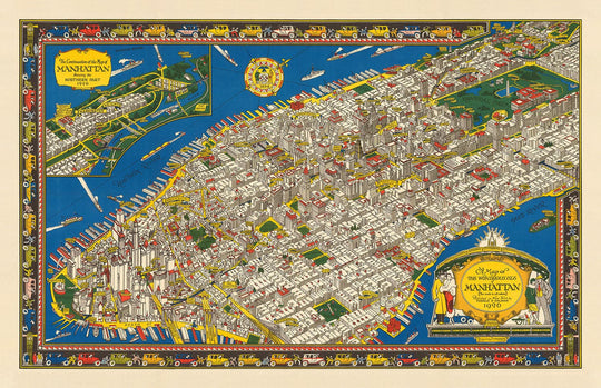 Old Pictorial Map of Manhattan, New York City, 1928 by Farrow: Washington Heights, Bridges