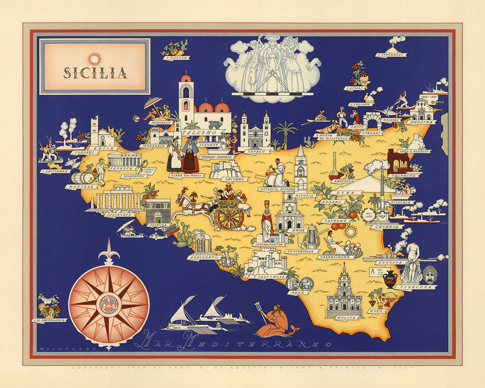 De Agostini's map not only serves as a geographical reference but also as a visual narrative of Sicilia's history and culture. The map features illustrations of ancient ruins, medieval castles, and Baroque churches, reflecting the region's rich architectural heritage. Additionally, it showcases local traditions, such as the production of olive oil, wine, and citrus fruits, providing insights into the region's economy and agricultural practices.