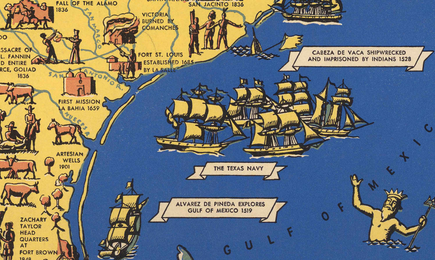 Old Pictorial Map of Texas History, 1936: Centennial, Fall of the Alamo, Houston, Dallas, Waco, Longhorn Cattle