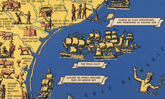The map includes some historical events that helped shape Texas today, including the introduction of the Texas Longhorns in 1716, the Fall of the Alamo, the Texas War for Independence from Mexico, and the establishment of Fort St. Luis by La Salle in 1685, which laid the foundation for the French claim to Texas.
