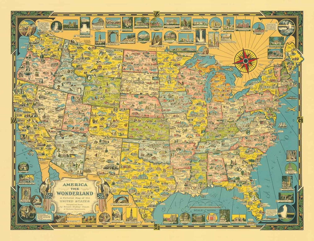 Old Pictorial Map of USA, 1941 by E. Chase: "America the Wonderland"