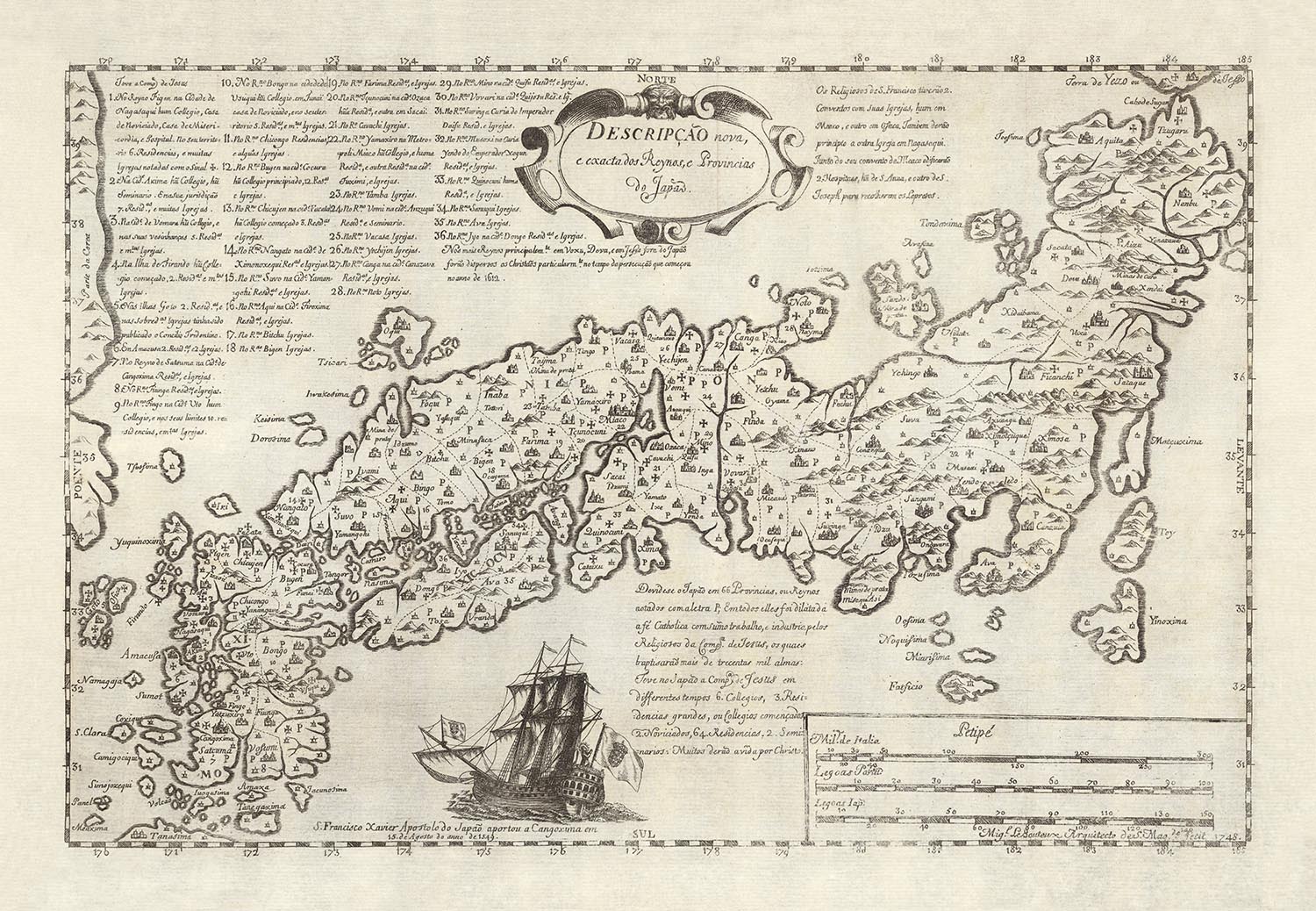 - The sailing ship at the bottom references S. Francisco Xavier, Apostle of Japan (Francisco Xavier, Cosme de Torres (1510-1570), and his arrival at Cangoxima on August 15, 1549.