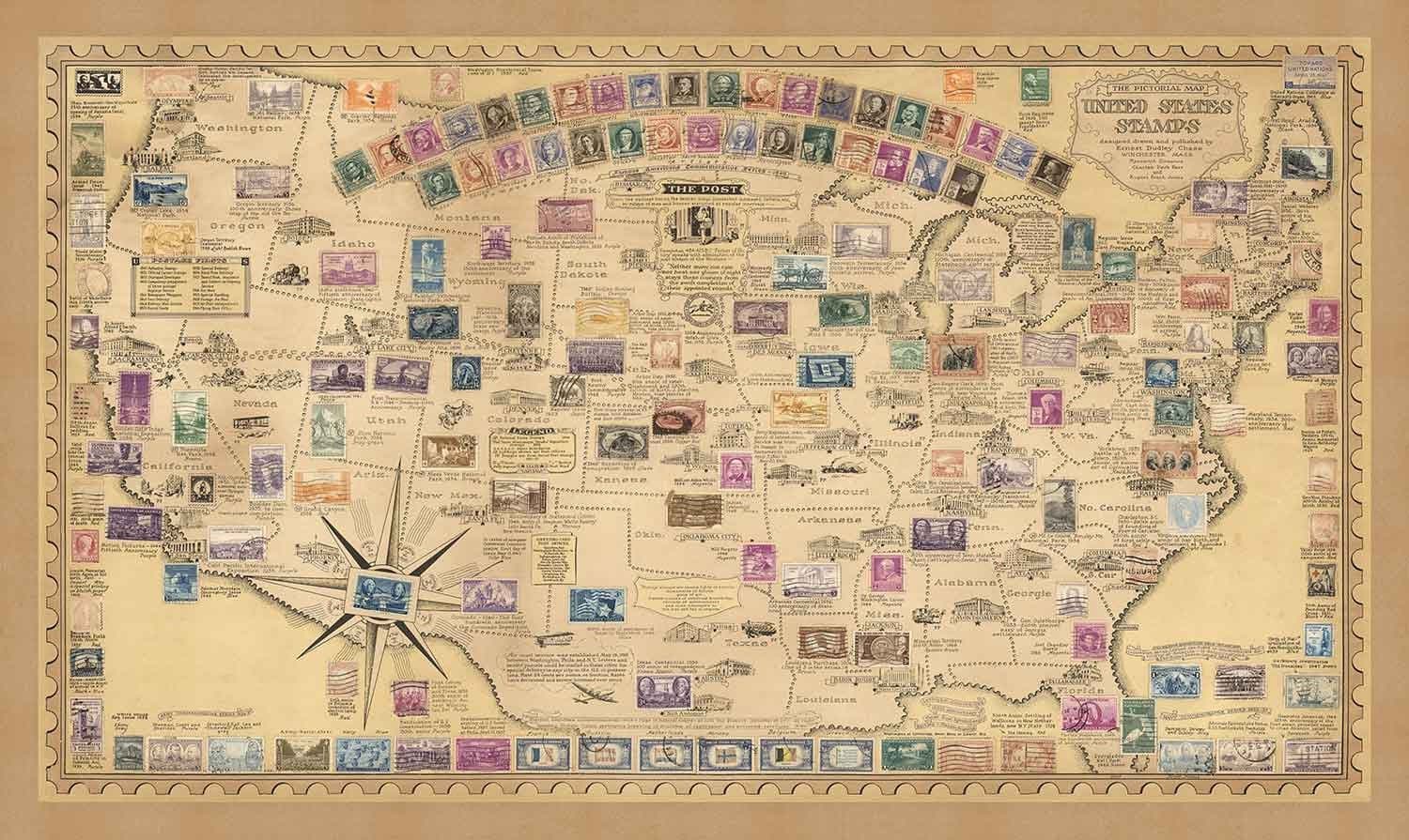 This rather unique map of the United States of America, originally published by Ernest Dudley Chase in 1949, features dozens of highly detailed illustrations of postage stamps, mostly from the 1930s and 1940s.