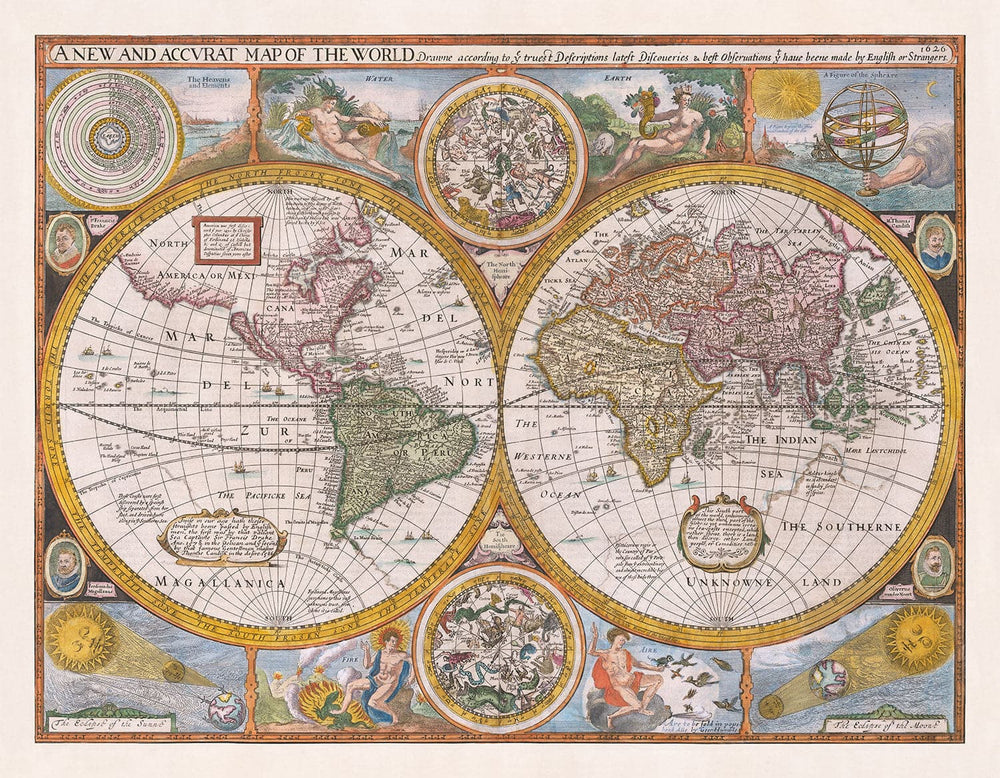 Back in 1626, our understanding of the world wasn't quite what it is today. California is an island! And there's no Antarctica or Australia - just the 'Southern Unknown Land'.