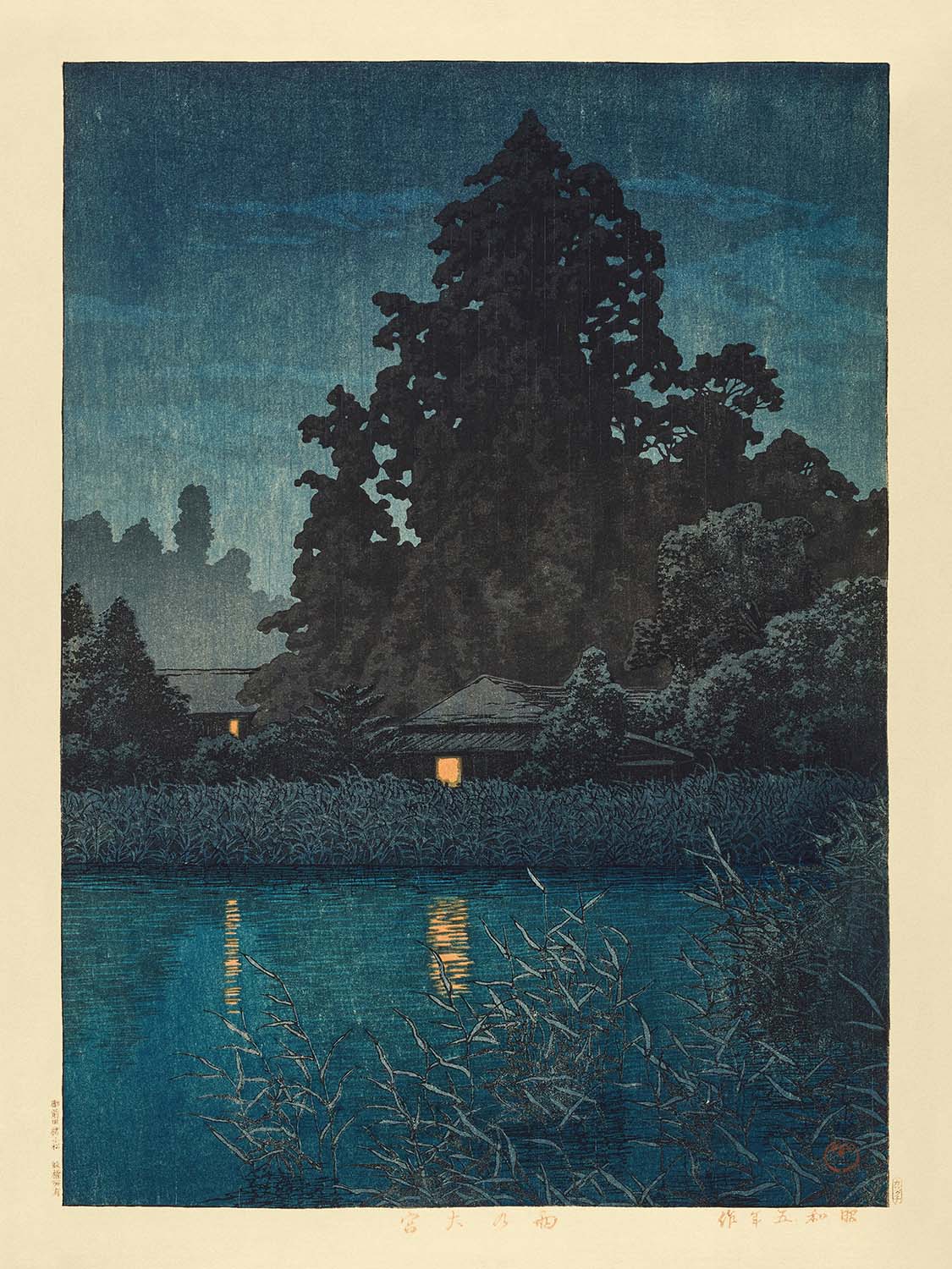Kawase Hasui stands as a pivotal figure in the Japanese shin-hanga movement. His notable contribution lies in his poetic landscapes that blend traditional and contemporary influences, reflecting the tranquil beauty of Japan. "Omiya in the Rain" (Japanese: 雨の大宮, Ame no Ōmiya) is significant for its ability to evoke emotional depth and atmosphere, drawing viewers into its introspective tranquility.