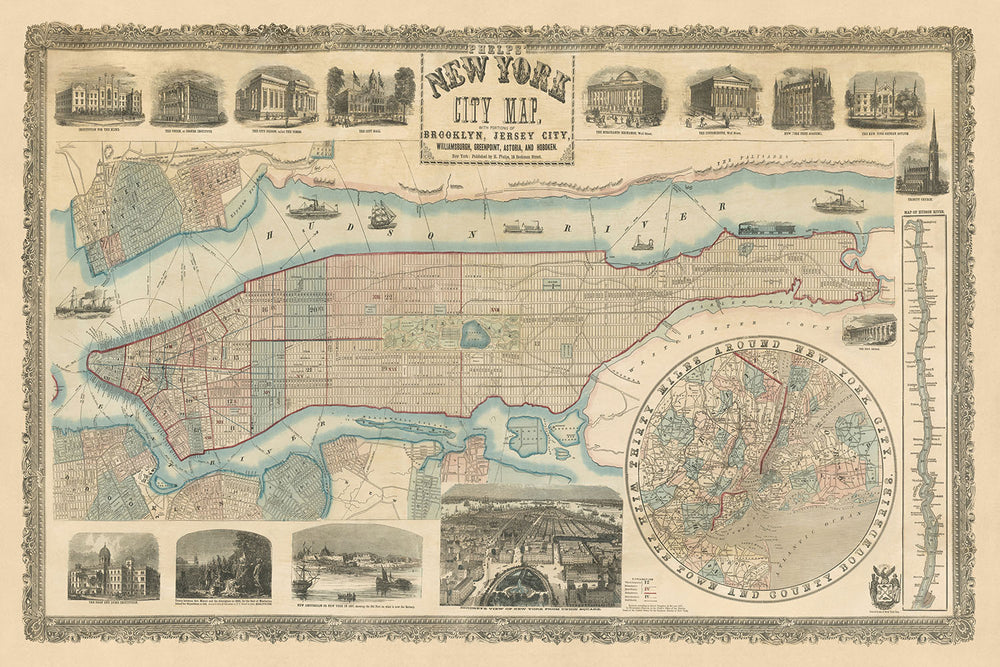 Embark on a historical journey through mid-19th century New York City with "Phelps' New York City Map, With Portions of Brooklyn, Jersey City, Williamsburgh, Greenpoint, Astoria, and Hoboken." Crafted meticulously by the esteemed mapmaker Humphrey Phelps in 1857, this map is not merely a navigational tool but a vibrant historical document. It captures the city at a pivotal moment, just as the grand project of Central Park was set to redefine urban public spaces. The map details the burgeoning street grid of Manhattan extending northward, juxtaposed with lingering pastoral elements like the Croton Reservoir and the pastoral expanse of Jones' Wood, offering a unique glimpse into a city on the cusp of modern urbanism.