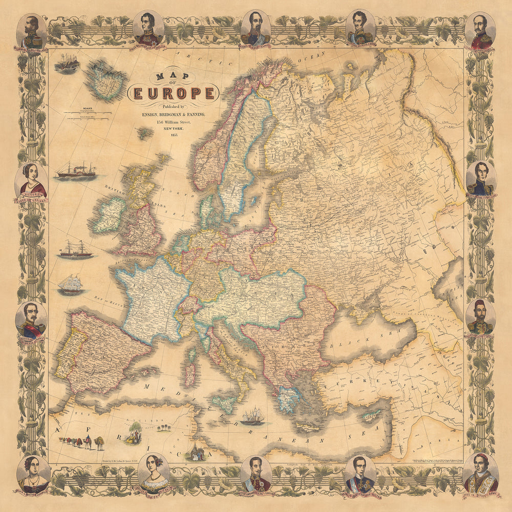 The "Map of Europe," published by Ensign, Bridgman & Fanning in 1855, is a stunning example of mid-19th century cartography. This full-colour map beautifully captures the political and physical geography of continental Europe, extending all the way to the Ural Mountains in the east and encompassing Turkey and Syria. The map is framed by intricate portraits of prominent figures of the era, including Queen Isabella II of Spain, Napoleon III of France, Queen Victoria of England, and other notable rulers, reflecting the political landscape and monarchical power of the time.