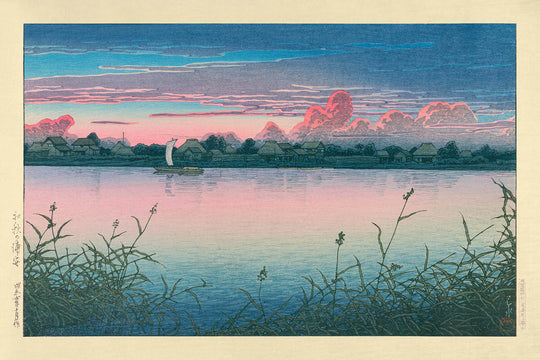 Sunset Lake and Sail Bot by Hasui Kawase, an exquisite woodblock print from 1935, beautifully captures the tranquil harmony of nature and traditional Japanese artistry. Kawase, a celebrated figure in the shin-hanga movement of early 20th-century Japan, revitalized traditional woodblock printing with his stunning landscapes. This particular piece, with its masterful depiction of a peaceful lake at sunset, exemplifies Kawase's adept ability to blend realism with the ethereal beauty found in nature.