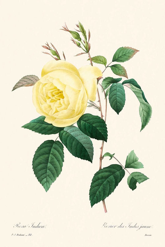 Yellow Rose, first unveiled in 1802, is a stunning example of Victorian botanical illustration by famed artist Pierre-Joseph Redouté. Among the most revered botanical illustrators in history, Redouté dedicated much of his career to capturing the beauty of flowers at Château de Malmaison, under the patronage of Josephine Bonaparte, the wife of Napoleon. Belgian-born, he rose to prominence as a painting instructor for Marie Antoinette, and his prolific work encompasses over 2,100 botanical paintings featuring more than 1,800 species.