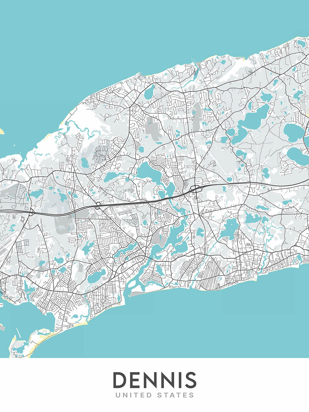The Dennis map is a modern, detailed street map of the city, focusing on the intricate network of roads and the precise layout of the urban landscape. It is designed to be a visually striking piece of art, a conversation starter, and a stylish addition to any home or office. The map covers a significant portion of the city, including the charming Dennis Village, the scenic East Dennis, the vibrant Dennis Port, the tranquil West Dennis, and the serene South Dennis.