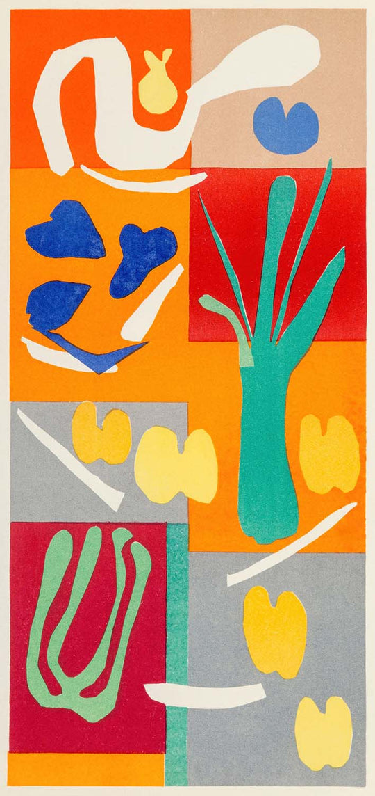Henri Matisse's "Végétaux" (Plants), created in 1952, is a striking exploration into his unique style of vibrant color fields and simplified forms. Often regarded as a master of color and composition, Matisse's work during this time showcases his ability to evoke emotion through bold yet minimalistic design elements.