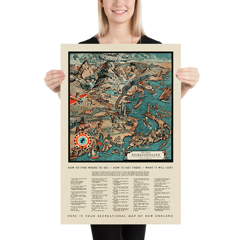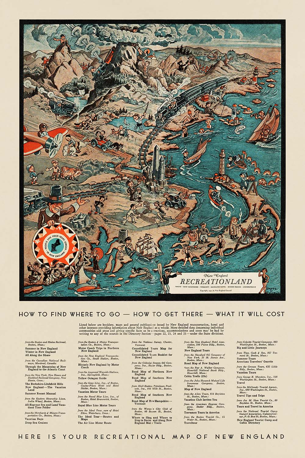 This poster’s subject is New England itself: a region of storied seacoasts and inland retreats, rendered here as a lively “recreationland.” It embodies the optimism of postwar American travel, when families set out to discover lighthouses, historic towns, beaches, and wooded hills in a single sweeping itinerary. True to the period’s practical-meets-playful design ethos, the artwork integrates informative text along the bottom, offering helpful travel details to complement the visual tour.