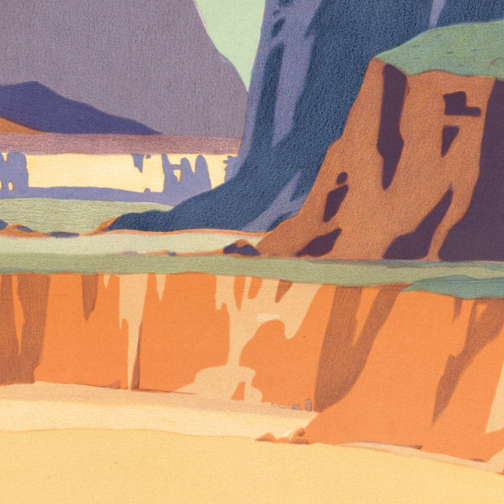 Design you can feel across the room: The palette leans into warm, sun-baked oranges and reds balanced by cool purples in the mountain shadows, with accents of desert greens and sky blues for contrast. Flat, smooth color fields and clean, geometric forms create crisp silhouettes—angular peaks against rounded pottery and stylized figures—producing a rhythmic, layered composition that reads clearly from a distance. This harmony of shape and hue is classic Art Deco: glamorous yet restrained, decorative yet purposeful. Hung in an entryway, office, or living room, it becomes a radiant focal point and an instant conversation starter for anyone who loves the Southwest, rail history, or vintage design.