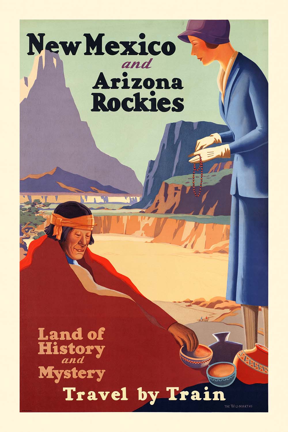 New Mexico and Arizona Rockies—Land of History and Mystery—by The Willmarths (1925) is a quintessential Art Deco travel poster from the American Southwest. Conceived in the interwar golden age of rail, it blends modernist design with the romance of discovery, inviting viewers to explore the dramatic Rockies and desert mesas by train. The composition pairs bold, geometric mountains with stylized figures and pottery, evoking the region’s deep cultural roots and the railroads’ promise of effortless adventure.