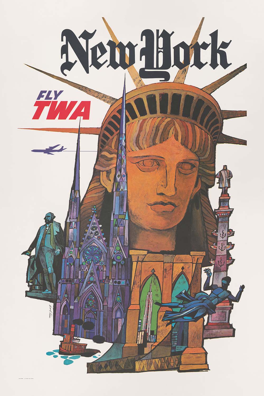 This New York poster distills the city’s allure into a handful of instantly legible forms: the torch-bearing Liberty at center, soaring skyscrapers recalling icons such as the Empire State Building, and a sleek aircraft that vaults across the scene to connect viewer and destination. Beyond advertising, it is a cultural artifact—evidence of how airlines and artists collaborated to sell not only tickets, but a modern, mobile lifestyle at the height of commercial aviation’s expansion.