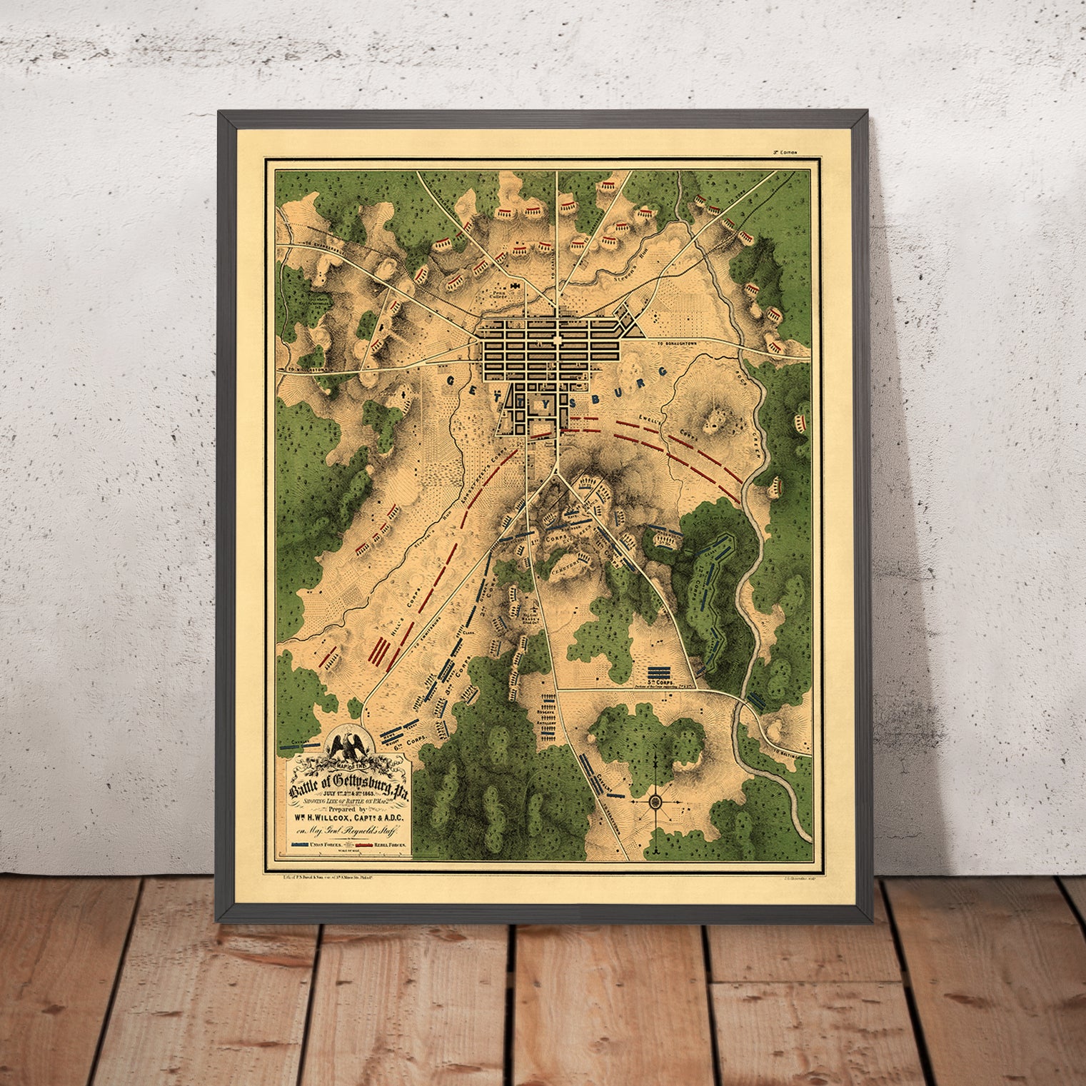 Historically, the map preserves the turning of the war’s tide. Gettysburg ended the Confederate thrust into the North and set the strategic stage for Union ascendancy; the dispositions Wilcox traced illuminate the command decisions that made that outcome possible. By naming Confederate corps and identifying Union division commanders, it clarifies chains of responsibility in moments of crisis, from Warren’s swift recognition of Little Round Top’s importance to the fraught Union salient at the Peach Orchard. Scholars and collectors prize such immediate visual testimony, where terrain, troop placement, and civilian geography meet—an indispensable guide to understanding July 2, 1863, and the broader meaning of the campaign.