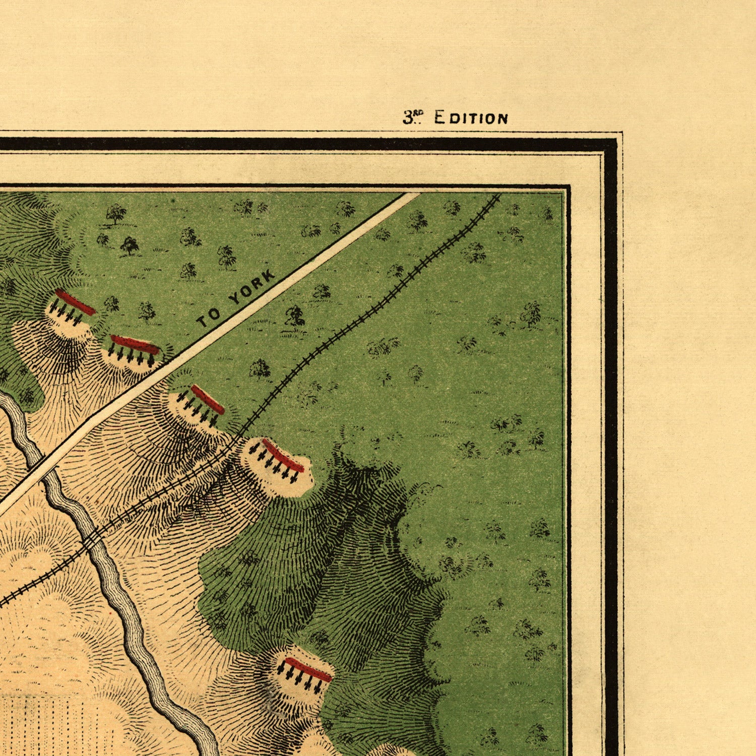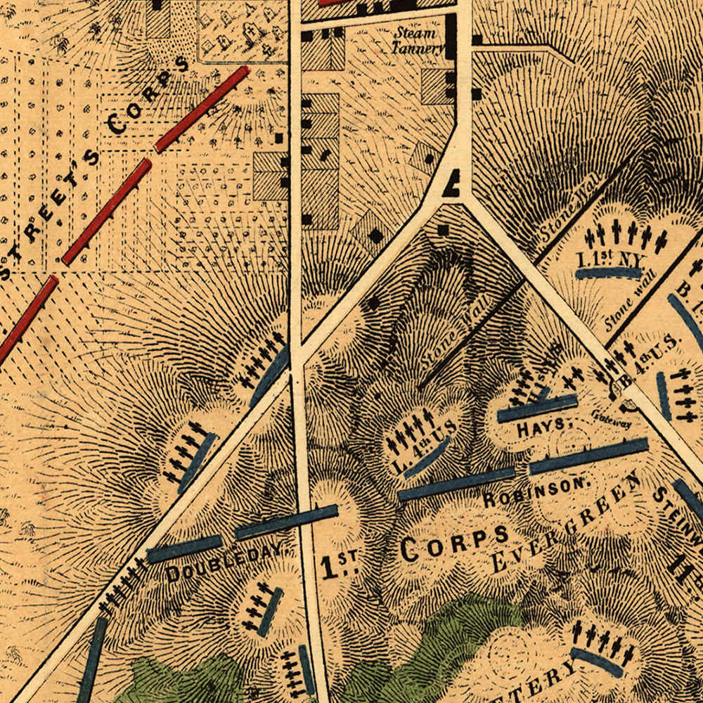 The map’s military grammar reads crisply: the Union “fishhook” line arcs from Culp’s Hill and Cemetery Hill along Cemetery Ridge to Little and Big Round Top, while Confederate formations mass opposite, poised for the evening’s fierce assaults. It renders the critical sectors of Devil’s Den, the Wheatfield, and the Peach Orchard, where Longstreet’s strikes collided with forward Union positions along the Emmitsburg Road. Kershaw’s Brigade appears at its jumping-off ground, and lines of engagement are sketched with care. Union breastworks, stone walls, and cavalry positions are annotated to show a defensive network improvising under pressure, with artillery crowned on commanding ridges. The map thus preserves the moment when shifting lines and hard terrain conspired to decide the day.