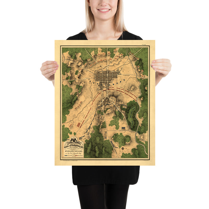 • Regions depicted: Gettysburg, Pennsylvania, particularly focusing on the battlefield area and surrounding structures.