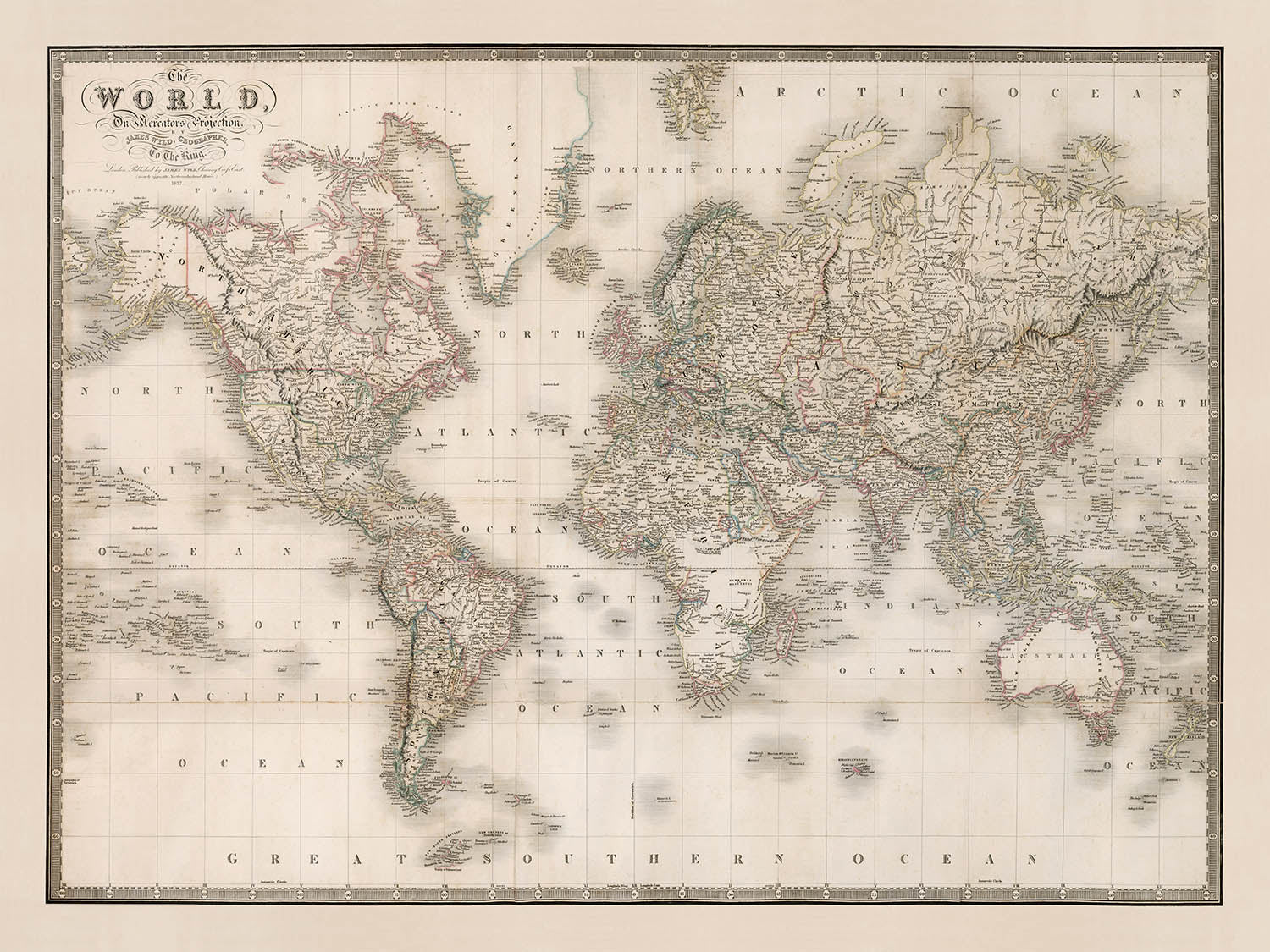 The World on Mercator's Projection, issued by James Wyld in 1837, is a confident, navigationally minded portrait of the globe at the dawn of the Victorian era. True to Mercator’s genius, it preserves bearings for mariners, casting the oceans as a grid of practicable routes while exaggerating the magnitude of high-latitude lands—Greenland and a schematic Antarctica loom vast beside comparatively compressed equatorial continents. Wyld balances this purposeful distortion with a lucid geometry of parallels and meridians, and an elegant, period-appropriate title cartouche that announces the work’s authority. The result is a world view shaped as much by navigation and empire as by measurement: a map designed for utility, yet composed with a refined, metropolitan polish.