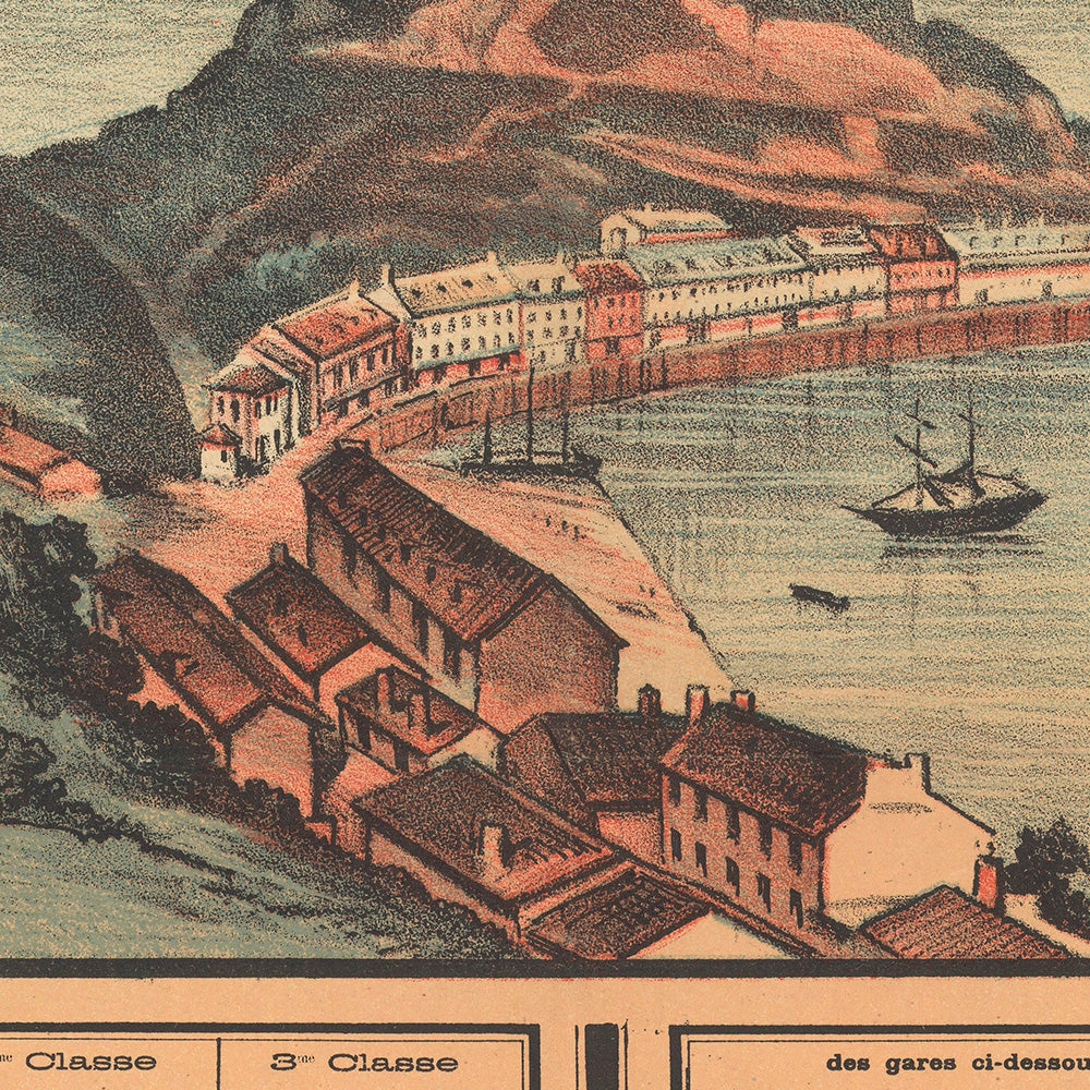 About the subject: the Chemins de Fer de l’Ouest network knit together Paris with Normandy and Brittany, and this poster highlights the coveted cross‑Channel connections to Jersey (St‑Hélier) and Guernsey via Granville and Saint‑Malo. You can see place names that resonate with travelers—Rennes, Dinard, and even Le Mont‑Saint‑Michel—making the piece especially meaningful for anyone who has strolled Saint‑Malo’s ramparts, sunned on Jersey’s beaches, or traced family ties in the Channel Islands. The text also notes coordination with British steamers (London & South Western Railway Company), a reminder of how seamlessly trains and boats once dovetailed.