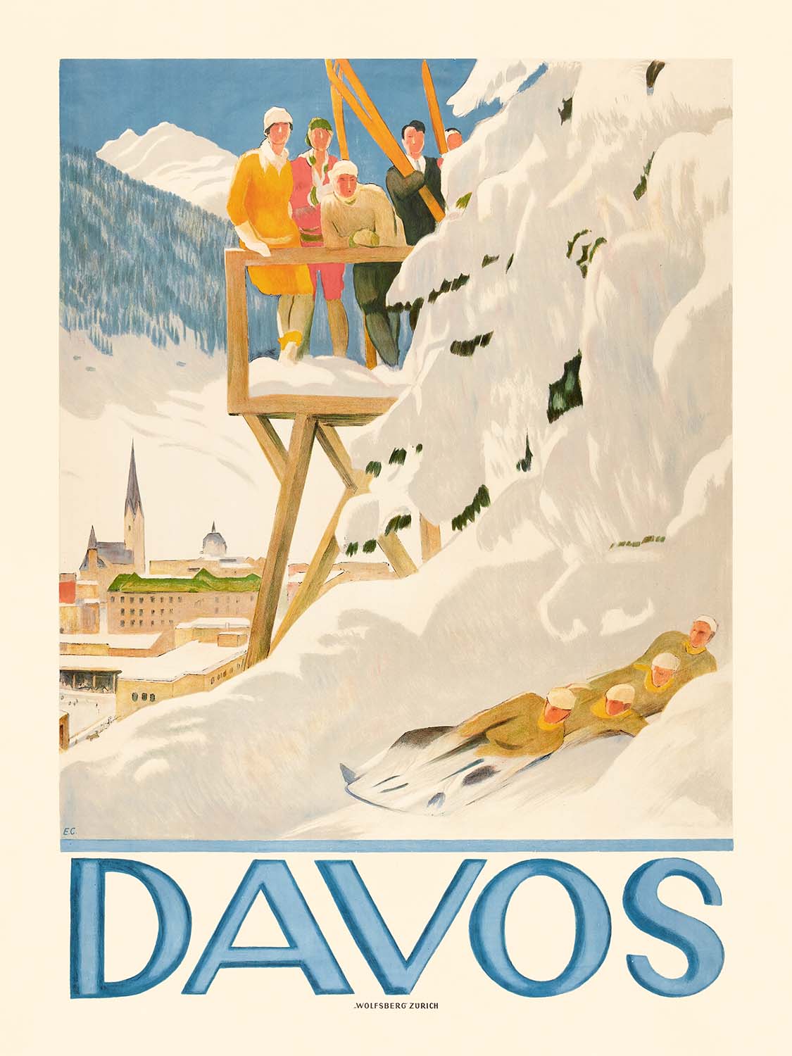 Davos by Emil Cardinaux (1918) captures the crystalline serenity of the Swiss Alps at the dawn of modern winter tourism. Cardinaux distills the high-mountain drama into crisp, geometric forms: snowfields in clean, luminous whites, a pale alpine-blue sky, and the town’s name, DAVOS, declared in bold, sunlit lettering that floats across the upper register. This iconic composition evokes the pure air and bright light that made the Graubünden resort a byword for health, sport, and elegant escape.