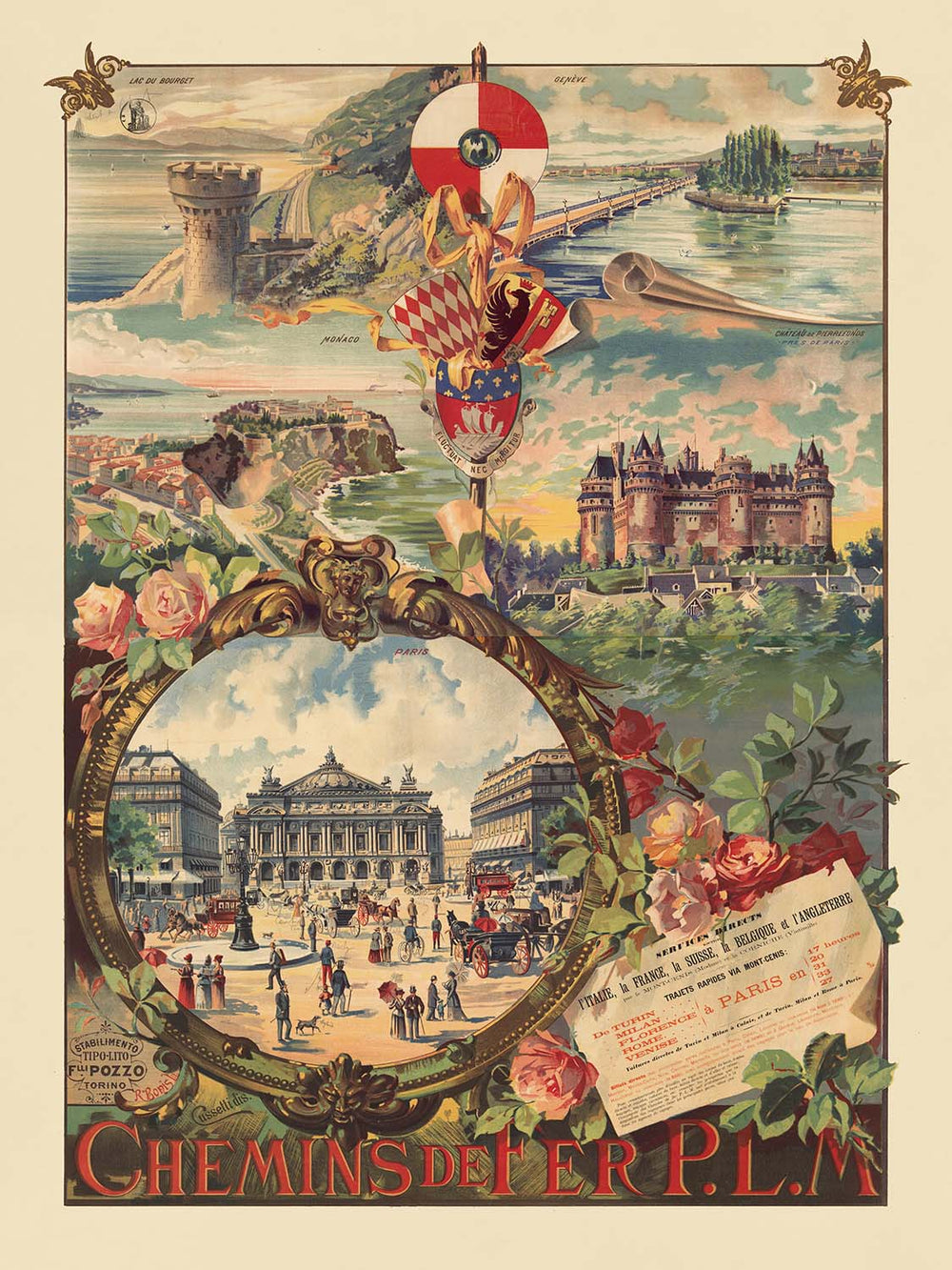 Chemins de Fer P.L.M. — Lac du Bourget, Genève, Monaco, Château de Pierrefonds by Carlo Cussetti (1890) captures the golden age of European rail travel, when the Paris–Lyon–Méditerranée network swept holidaymakers from the Savoyard Alps to the sunlit Riviera and onward to storied castles. In this Belle Époque poster, destinations are celebrated as a curated dream itinerary—Lac du Bourget and elegant Aix-les-Bains, cosmopolitan Genève, glamorous Monaco, and the romantic, turreted Château de Pierrefonds—inviting the viewer to sample France and Switzerland’s most alluring landscapes and landmarks in one grand tour.